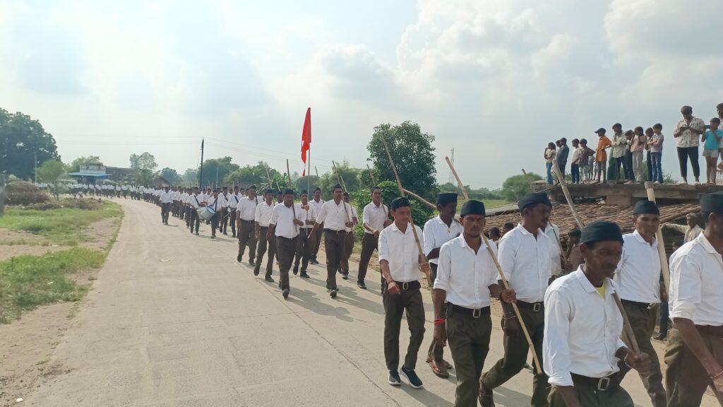 इस अवसर पर मंच पर सामाजिक कार्यक्रता पोमा जी महाराज, गोपाल अमलियार मण्डल कार्यवाह मौजूद रहे।आगे श्री चौधरी हमें भारत को पुनः अखण्ड राष्ट्र बनाना है तो शक्ति की आराधना आवश्यक है। अपने देश को सम्पन्न बनाना है तो स्व के भाव का जागरण करना, दूसरा नागरिक शिष्टाचार का पालन करना, तीसरा कुटुंब व्वयस्था को सम्हालक कर रखना और परिवार में मंगल सभा करना। चौथा सामाजिक समरसता का पालन करना और पाँचवा पर्यावरण संरक्षण करना। संघ ने 1925 से 2025 की यात्रा में अनुकरणीय कार्य किए। उन्होंने संघ की सौ वर्षों की यात्रा के बारे में बताते हुए कहा 1925 से 1940 तक सारे आन्दोलन इस कालखंड में पने चरम पर थे। ऐसे समय में डॉ केशव बलीराम हेडगेवारजी ने संत-महन्त व समाज को संगठित करना तथा प्राप्त स्वतंत्रता को स्थायित्व देना। भारतमाता को परम वैभव पर ले जाना है उसके लिए हम सभी को मिलकर कार्य करना है और हर घर से निकलना होगा यह देश मेरा है इस भाव से कार्य करना होगा। संचलन में सैकड़ो की संख्या में स्वयंसेवक शामिल हुए।