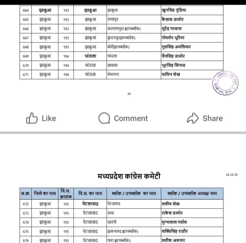 मध्य प्रदेश कांग्रेस कमेटी द्वारा हाल ही में प्रदेश के कई ब्लॉकों में ब्लॉक अध्यक्षों एवं उप ब्लॉक अध्यक्षों की घोषणा की है पूर्व केंद्रीय मंत्री कांतिलाल भूरिया जिला कांग्रेस अध्यक्ष प्रकाश रांका विधायक डॉ विक्रांत भूरिया वीर सिंह भूरिया की अनुशंसा पर मध्य प्रदेश कांग्रेस कमेटी अध्यक्ष जीतू पटवारी द्वारा झाबुआ जिले के 8 ब्लॉक एवं 5 उप ब्लॉक अध्यक्षों की घोषणा कर दी गई है।